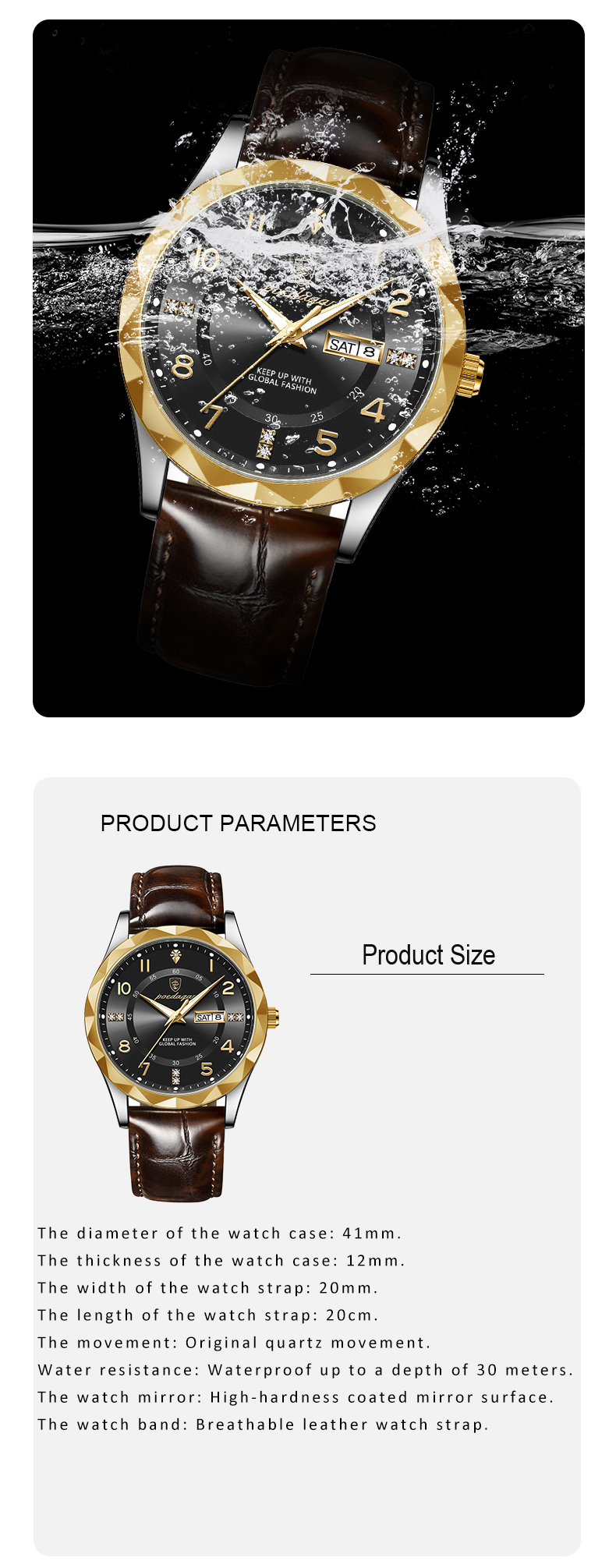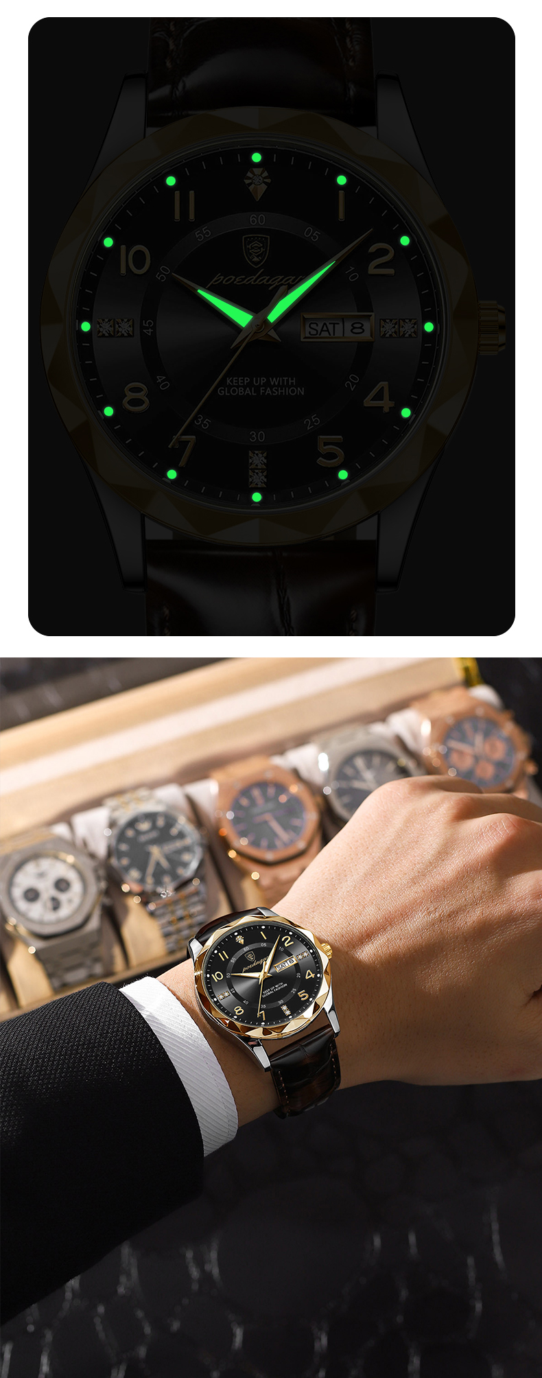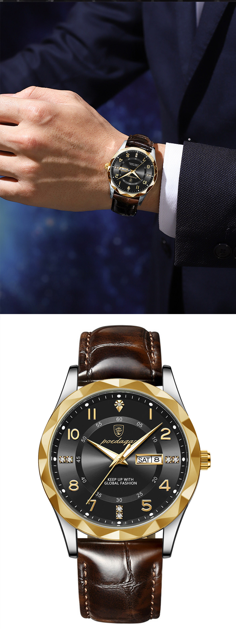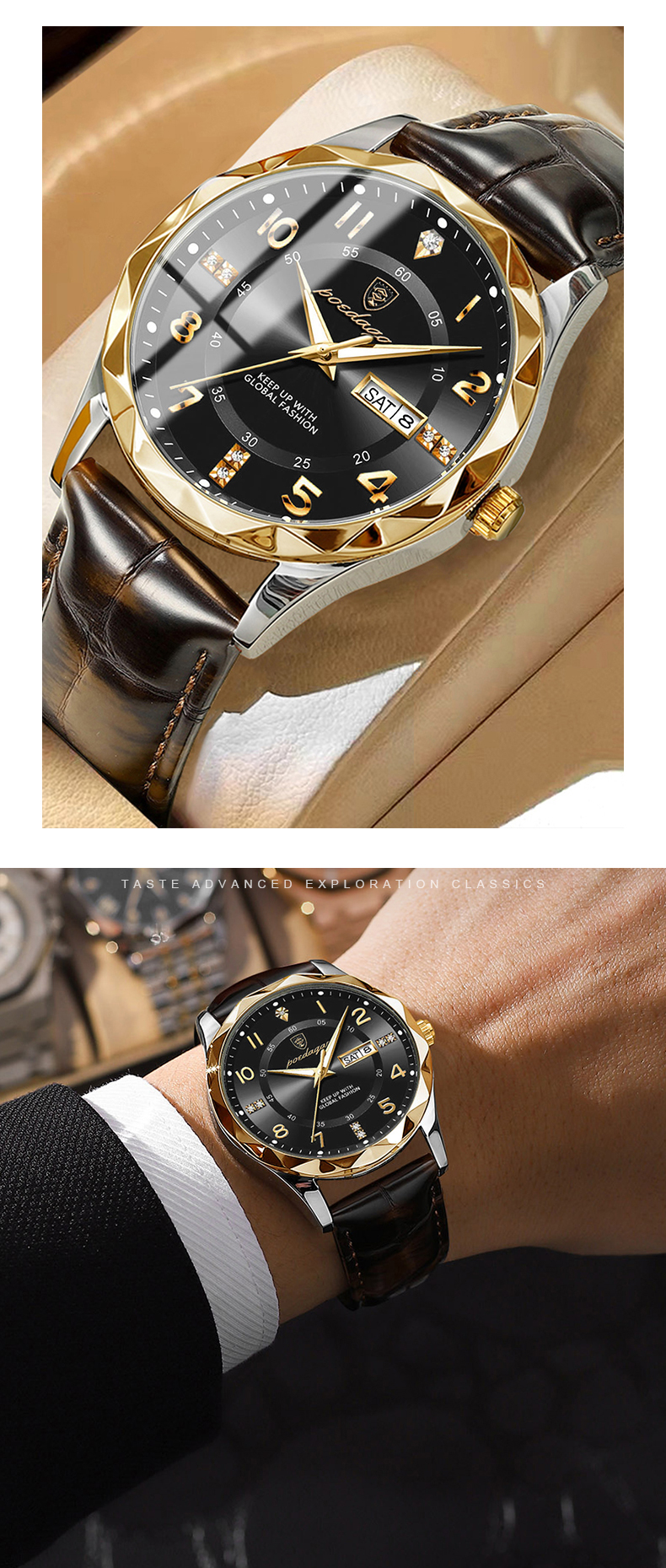 Trendy waterproof watch. Men's fully automatic mechanical watch with dual calendars, quartz movement and luminous function, a wristwatch
